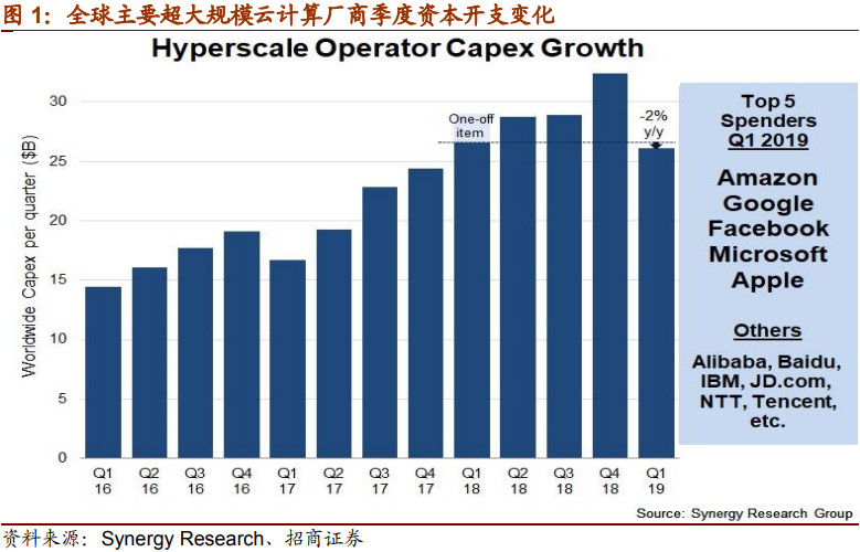 北美五大雲計算廠在經歷連續多個季度 Capex 增長後, 19Q1 YoY 下降約 2%, 行業對於光纖模組的需求也出現下滑趨勢, 主要提供商如中際旭創, Finisar, AOI (祥茂光電) 在 Q1 均出現不同程度業績下滑.