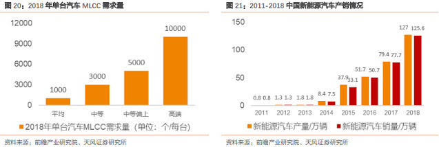 汽車電子需求強勁, 也帶動了 MLCC 用量的提升. 駕駛性能的提高和車用娛樂的普及, 帶來了汽車電子化率的提升, 每輛電動汽車使用的 MLCC 數量不斷增加. 高端汽車的用量則達到 10000 只/輛, 且仍在繼續增長.