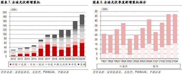 綜合考慮全球各區域疫情發展情況及疫情對太陽能電站建設的影響情況, 我們預測 2020 年海外需求約 80GW, 年減約 11%; 全球裝機約 120GW 年增持平, 並呈現連續季增態勢. 2021~2022 年需求有望分別達到 160GW, 190GW 恢復正常增長.