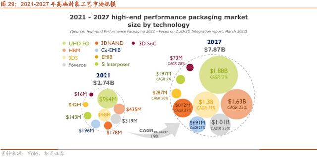 Yole 預計 2021 年針對 HBM 和 Si Interposer 的高端高性能封裝市場規模合計約 14 億美元, 其中 HBM 和矽中介層市場封裝規模分別為 4.35 億美元和 9.64 億美元. 預計 2027 年增至約 35 億美元. 矽中介層通常由台積電, 三星和聯電提供, 還包括 Intel 的 Foveros 方案.
