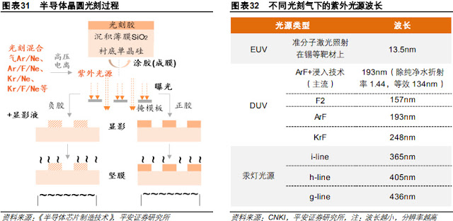 光刻即在矽片表面覆蓋一層具有高度光敏感性光刻膠, 再用紫外透過掩模照射在矽片表面, 被光線照射到的光刻膠會發生反應形成交聯結構, 此後用特定溶劑洗去被照射.光刻過程中一般用到的電子特氣為光刻混合氣(Ar/F/Ne, Kr/Ne, Ar/Ne, Kr/F/Ne 混合氣等).