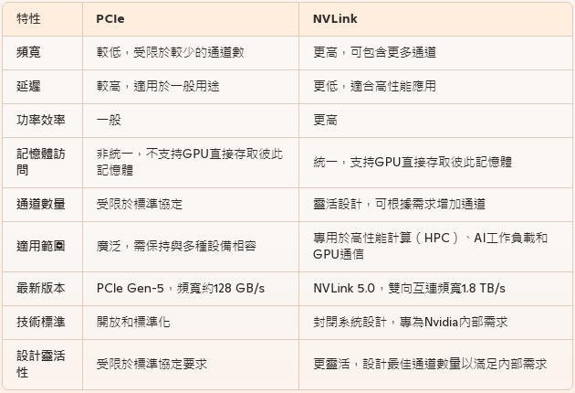 互連: NVLink 主導下的技術挑戰與突破. 輝達 NVLink 所能實現的 Scale-up 互連能力一騎絕塵. GB200 所依賴的 NVLink 5.0 技術能夠實現 1.8TB/s 的互連速度, 而其他廠商的 Scale-up 互連大多以 PCIe 協議為基礎, 目前 PCIe5.0 技術單通道雙向速率為 8GB/s, 16 通道可達 128GB/s, 遠遠低於 NVLink 同代技術. 從技術節奏來看, 挑戰輝達 NVLink 的難度較大.